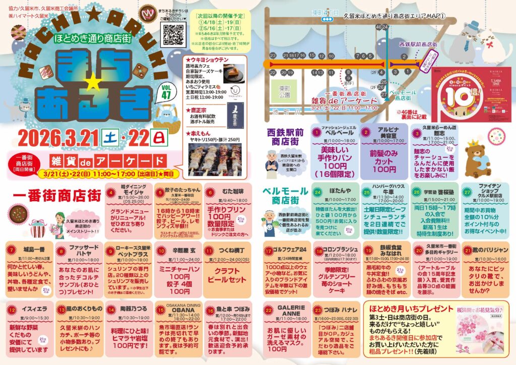 ほとめき通り商店街は、西鉄久留米駅前から六ツ門町にある、六ツ門・六ツ門あけぼの・一番街・西栄通・東町明治通・ベルモール・西鉄駅前の7つ商店街で構成された商店街のグループ団体です。