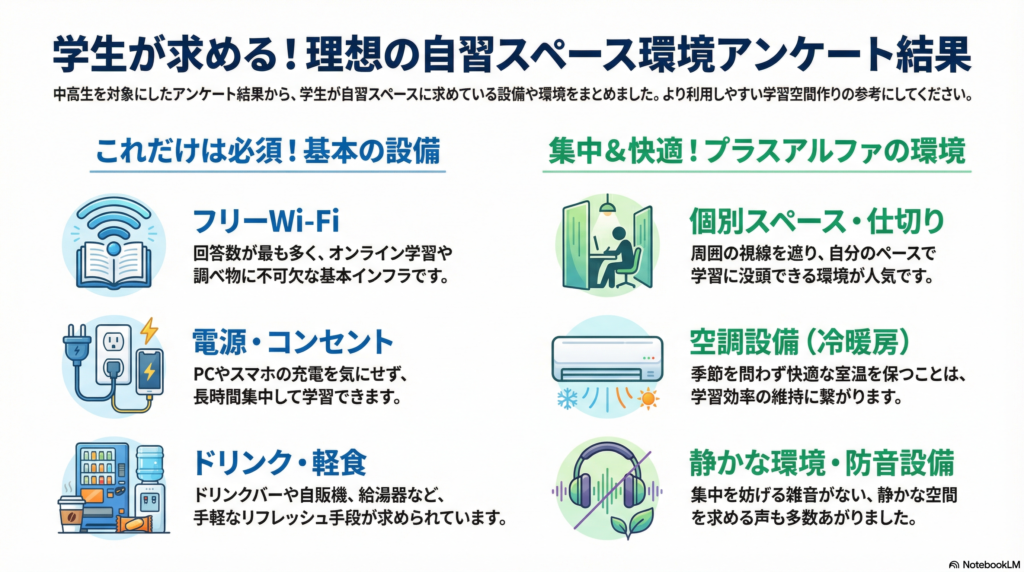 特に「フリーWi-Fi」と「コンセント」は、現代の学生にとって必須のインフラとなっていることがわかります