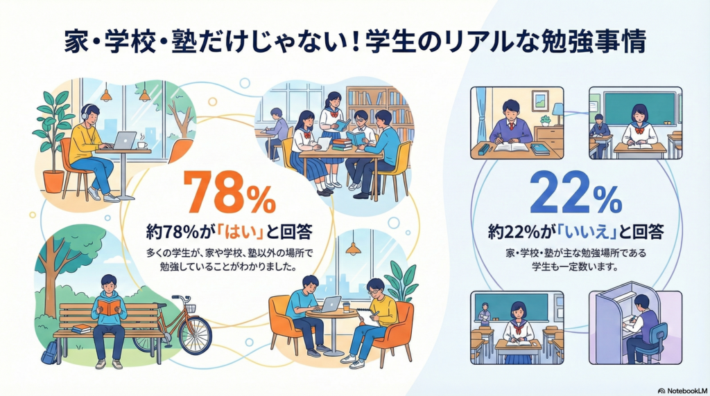 今回のアンケート結果からも、多くの学生が「家以外で集中できる場所」を探してさまよっている**「勉強難民」**であることがわかりました。